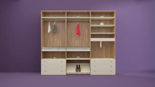 Oprócz regulowanych półek i drążków na ubrania, polecamy na przykład wewnętrzne szuflady. Liczba i wysokość szuflad może być konfigurowana w sposób zmienny.